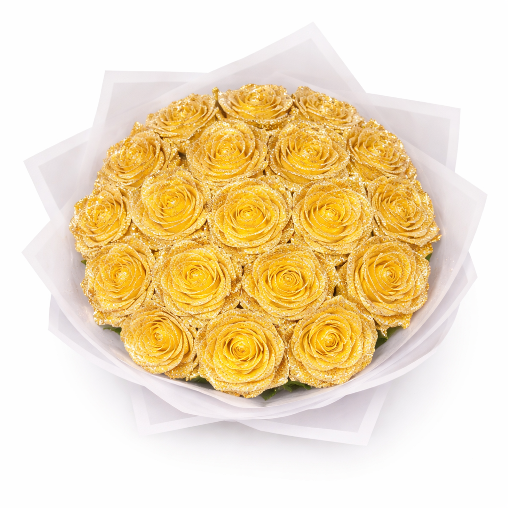 Tedd igazán különlegessé az ajándékozás pillanatát ezzel a lenyűgöző, arany csillogású örök rózsa csokorral ✨