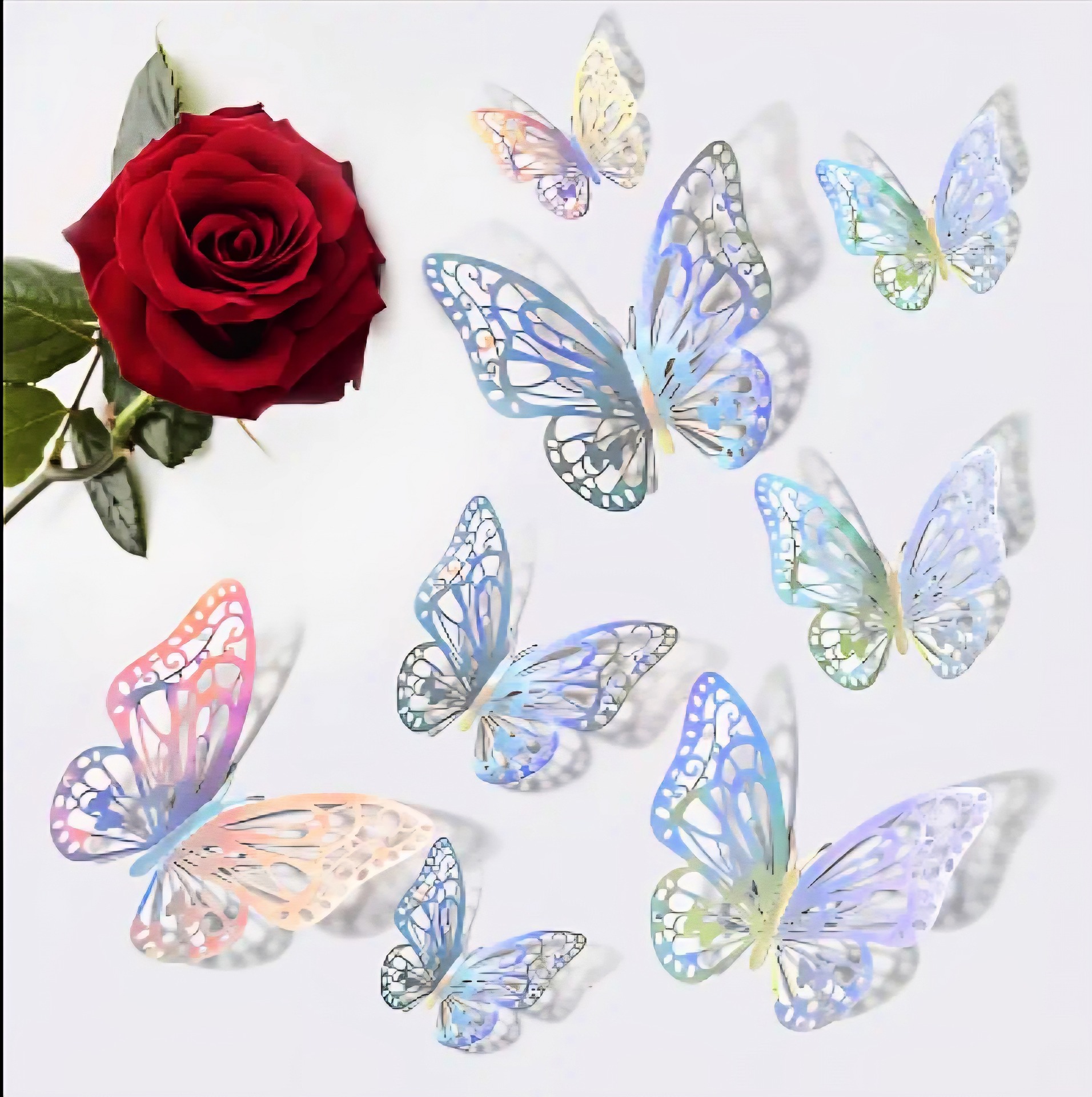 Ezek a varázslatos színjátszós pillangók igazi különlegességet visznek bármilyen meglepetésbe. A finoman áttetsző, holografikus szárnyak minden szögből más árnyalatban tündökölnek – így tökéletes kiegészítői csillámos rózsacsokroknak, ajándékdobozoknak vagy ünnepi dekorációknak.